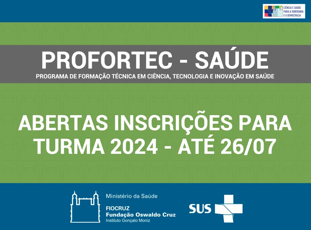 Estão abertas, até o dia 26/07, as inscrições para o processo seletivo da turma 2024 do PROFORTEC-Saúde (Programa de Formação Técnica em Ciência, Tecnologia e Inovação em Saúde). Interessados podem se inscrever neste link. A qualificação em serviço acontecerá no perÃodo de outubro de 2024 a março de 2027, com exigência de 40 horas semanais de dedicação ao programa.
