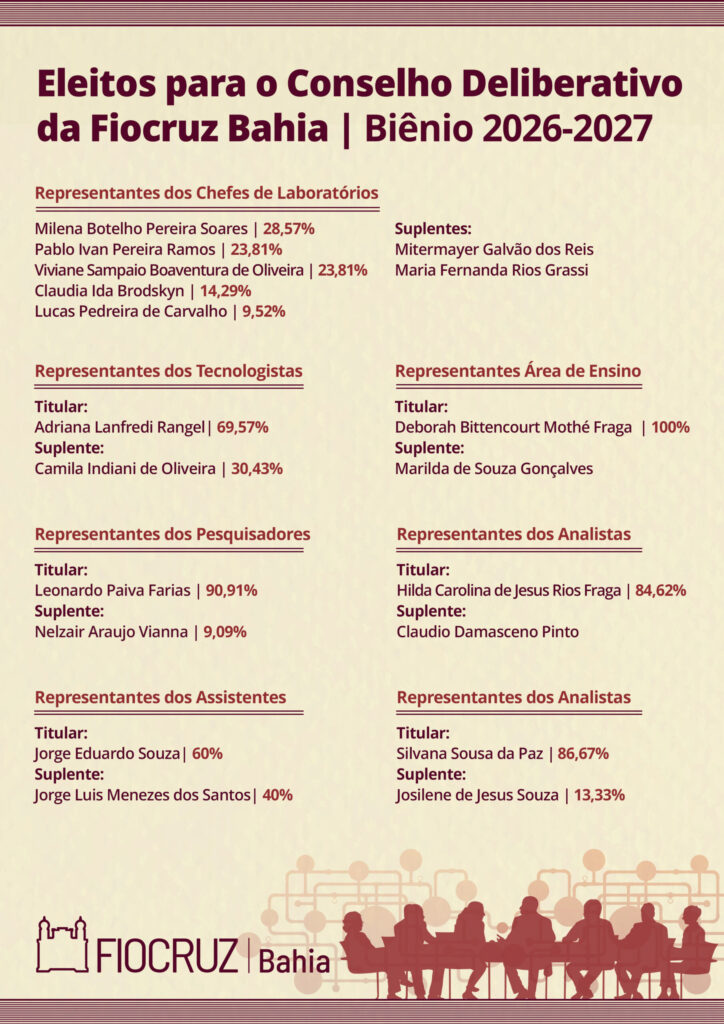 Foi realizada entre os dias 02 e 03 de dezembro de 2025, a votação para escolha dos representantes do Conselho Deliberativo (CD) da Fiocruz Bahia. Foram eleitos titulares e suplentes para as seguintes áreas e categorias funcionais: representantes das chefias de laboratórios (05); representante da área de ensino (01); representante dos pesquisadores (01); representante dos tecnologistas (01); representante dos técnicos (01); representante dos analistas (01); representante dos assistentes (01).