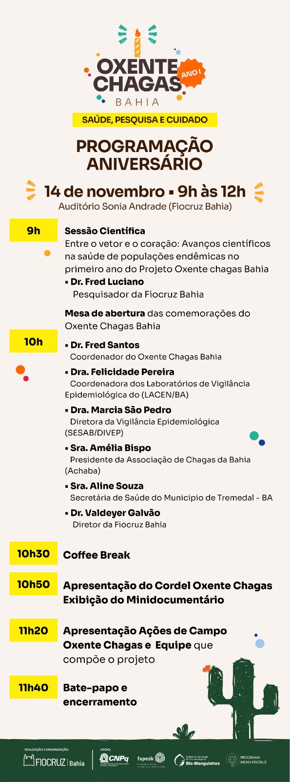 A programação inclui palestras, exibição de um documentário sobre as ações do projeto, uma exposição fotográfica e o lançamento do cordel “Oxente Chagas Bahia”, celebrando a união entre ciência, cultura e território.