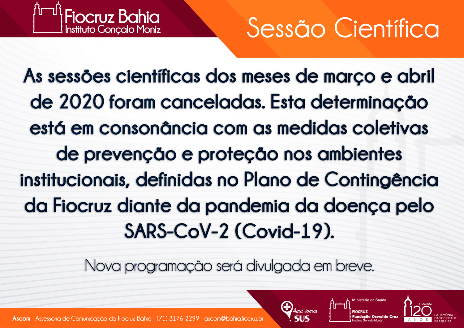 Sessão Científica – Não haverá sessão científica nos meses de março e abril de 2020